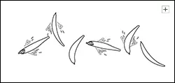 Рывками удилищем с паузами, при которых приманка остается лежать на поверхности, можно имитировать мелкую рыбешку, охотящуюся за насекомыми. Благодаря изогнутому телу приманка после рывка может двигаться в самых разных направлениях. Если же увеличивать паузы и заставить приманку «дрожать» на поверхности, то создается имитация обессиленной рыбки – легкой добычи любого хищника.