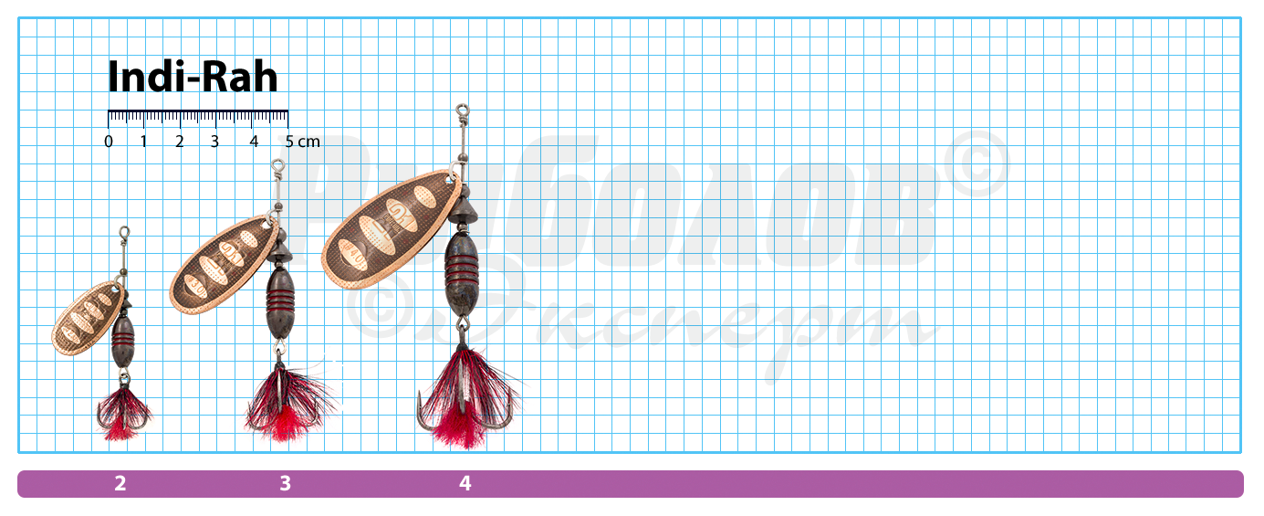 Для серии Indi-Ra разработчики Pontoon21 адаптировали форму классического лепестка Indiana. Именно такой тщательно выверенный в пропорциях по отношению к удельному весу металла лепесток способен стабильно вращаться в комбинации с большим утяжелённым сердечником, что встречается крайне редко при использовании иных форм лепестка. Поперечные проточки по веретенообразному телу создают собственный гидродинамический эффект. Конструкция с таким сердечником очень популярна у рыболовов, которым необходим максимально дальний и ювелирно точный заброс, особенно при ловле на течении.